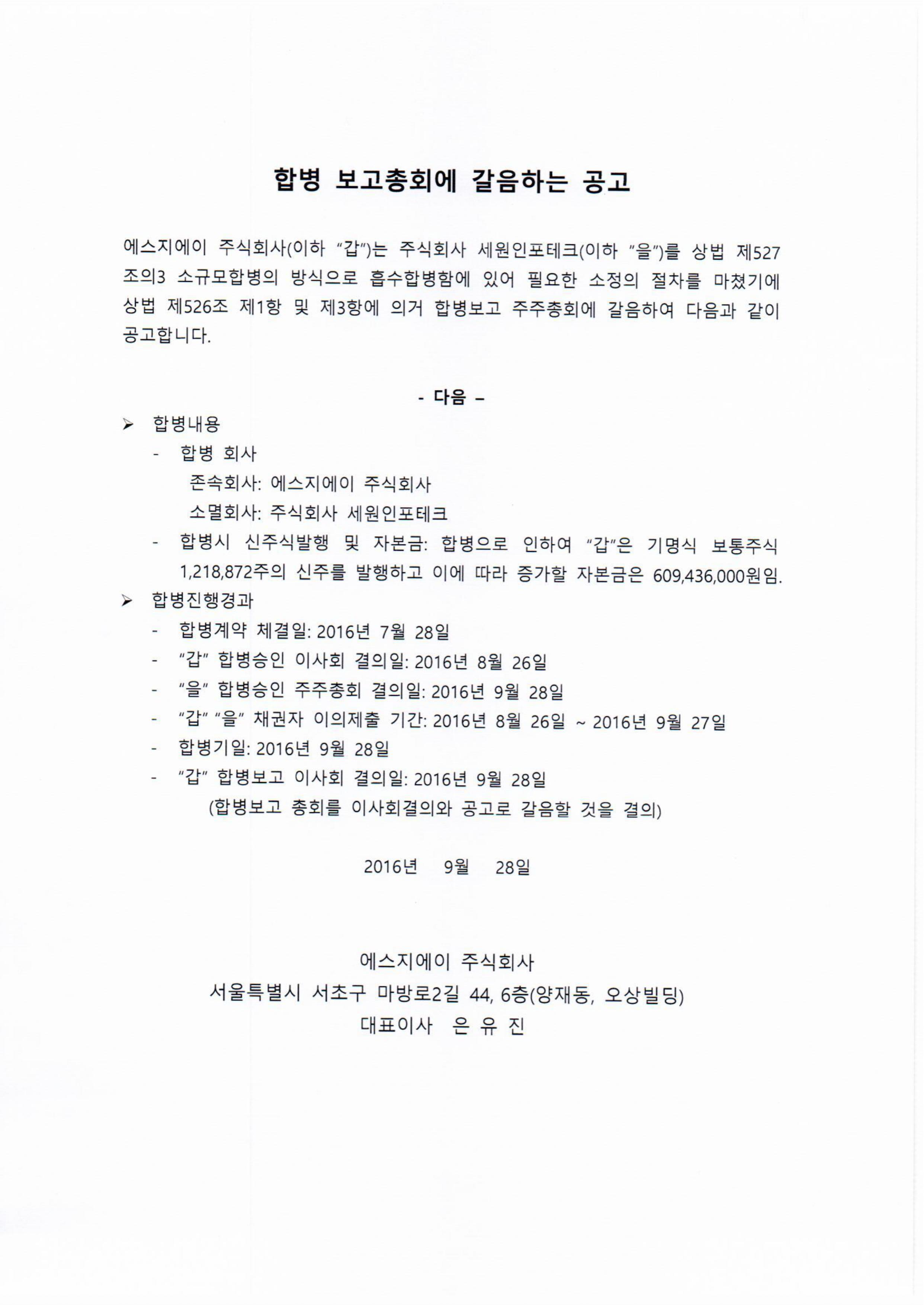 합병 보고총회에 갈음하는 합병보고 공고