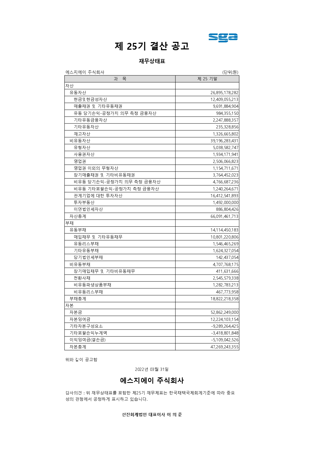 상법 제 449조에 의해 에스지에이㈜ 제25기 결산내용을 공고합니다.