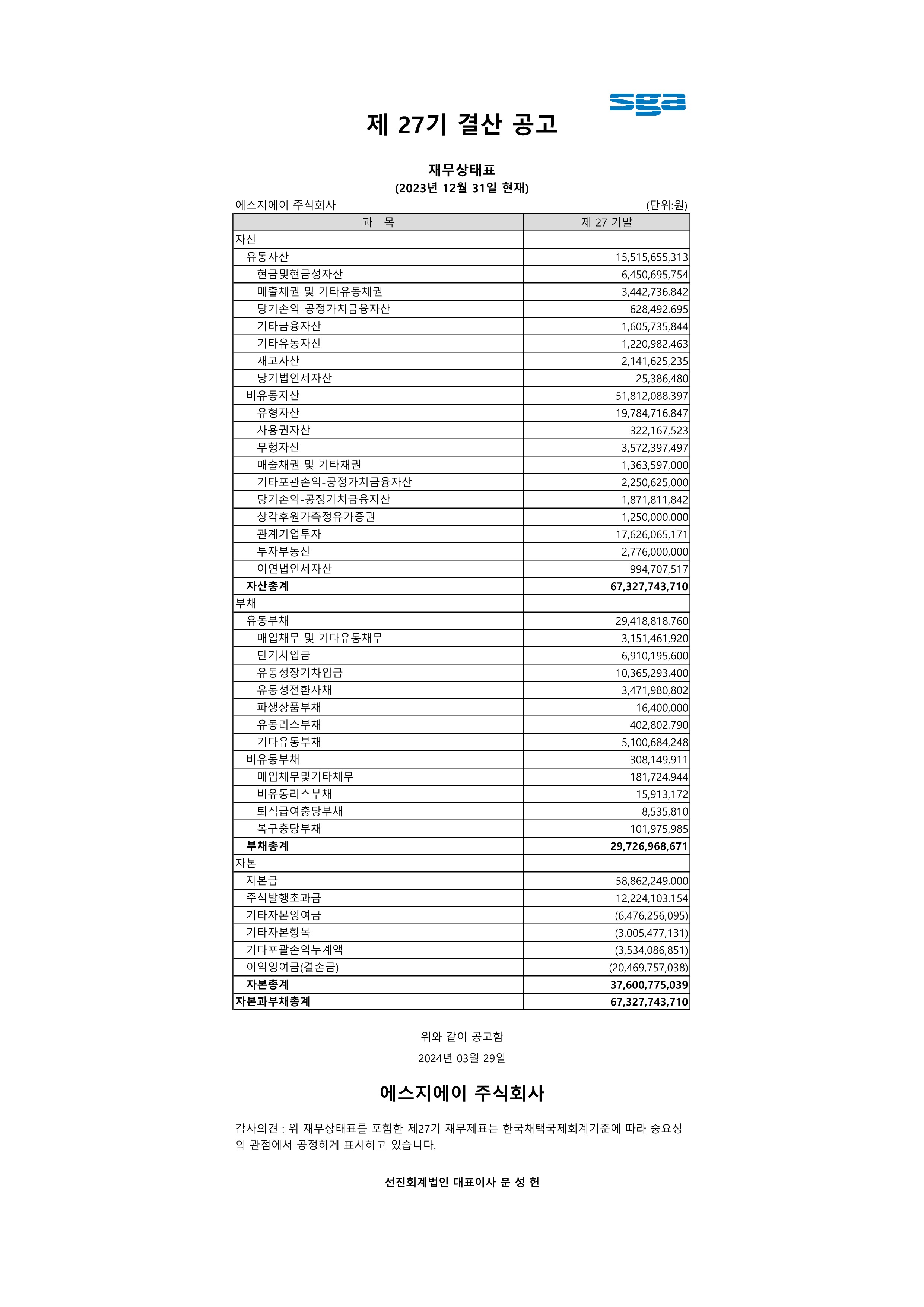 SGA㈜ 제27기 결산공고