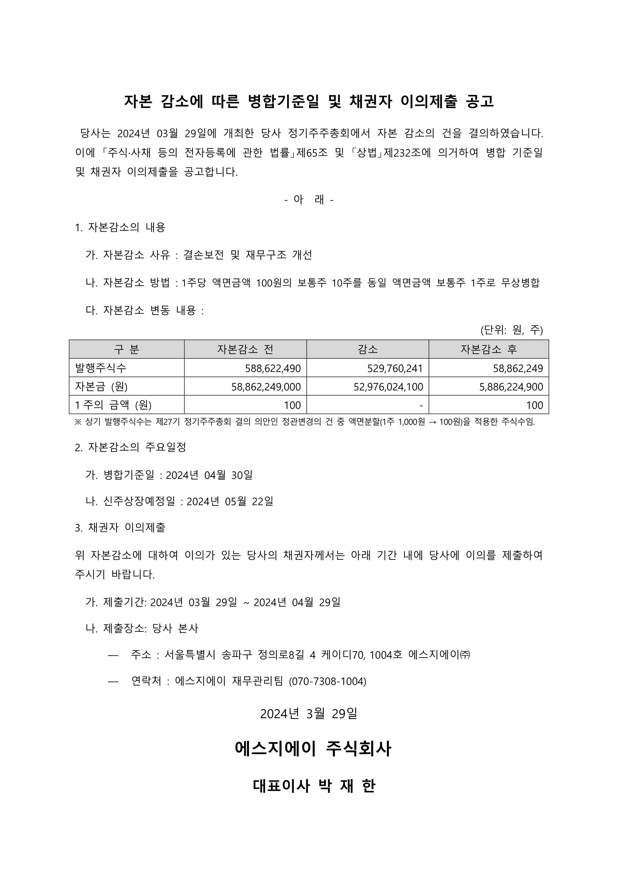 자본 감소에 따른 병합기준일 및 채권자 이의제출 공고